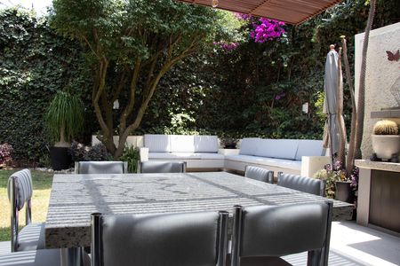 Uno de los espacios que destacan en esta propiedad es la terraza techada y jardín que se integran perfectamente a una de las estancias principales, permitiendo que sea el mejor escenario para reuniones y eventos con familia y amigos.